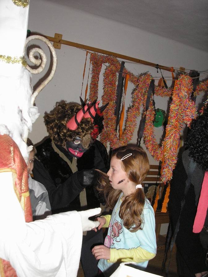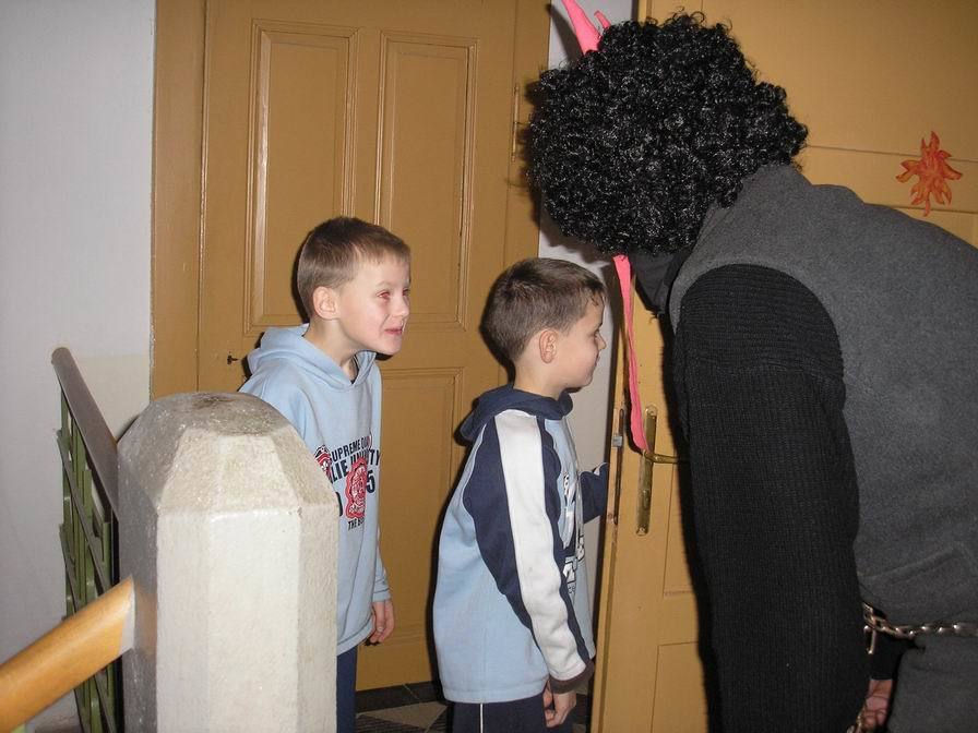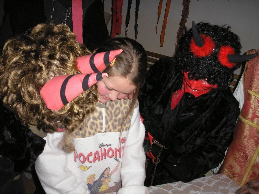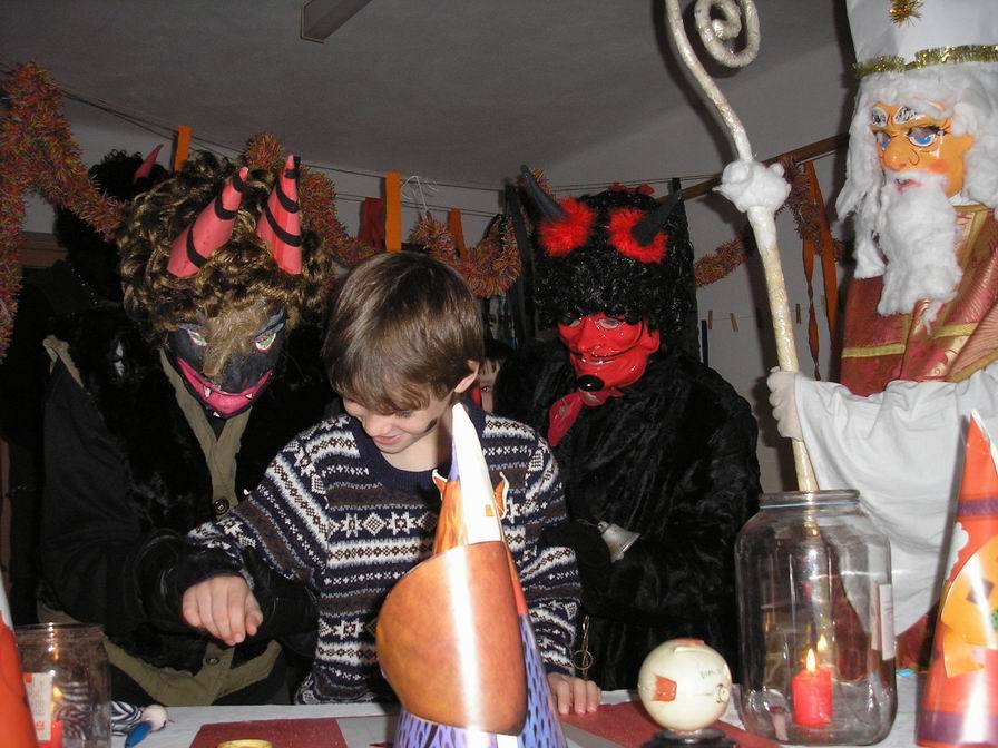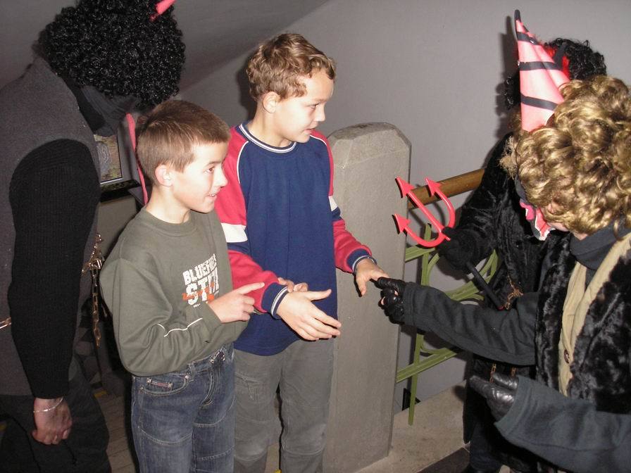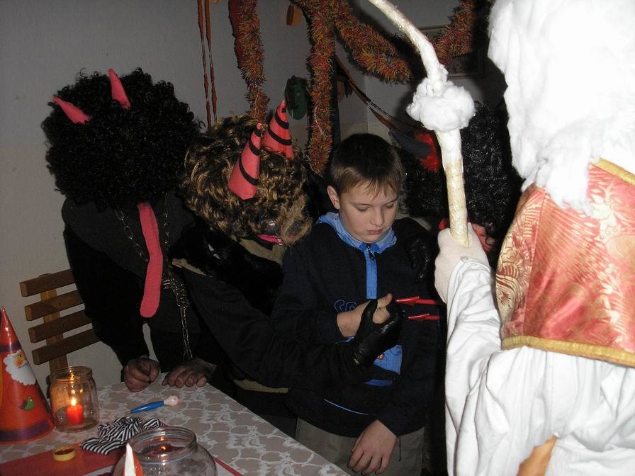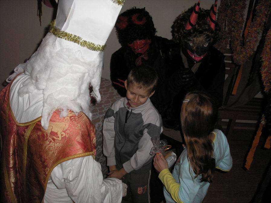 Po zabušení na pekelnou bránu se otevřely dveře místnosti mezi půdami a vyřítili se na nás tři pekelníci. Ti nás zavlekli dovnitř, kde jsme ve světlech svíček rozeznali nejen pekelné vybavení, ale především Mikuláše, který dbal na správný průběh nadílky.