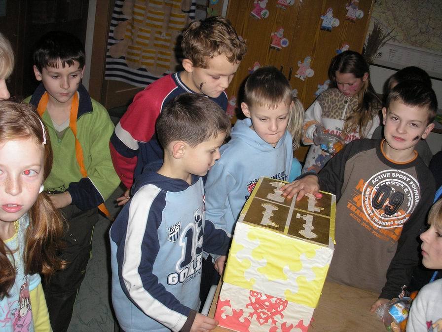 Poklad jsme donesli až do školy, kde v tělocvičně nálezce truhlici otevřel a spravedlivě poklad rozdělil mezi všechny hledače. Každý dostal knížku a sladkosti.