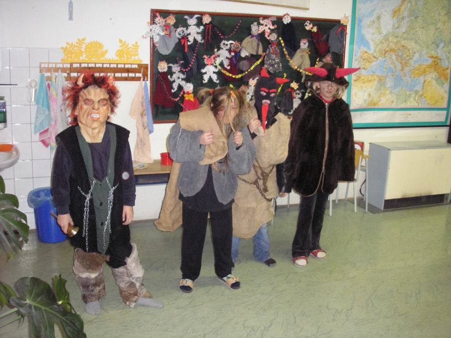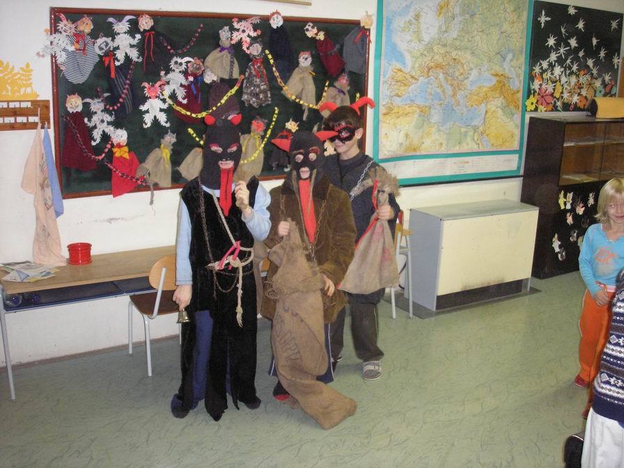Čerti nás opět překvapili. Krátce po 8. hodině ranní nám vhodili do třídy veršovaný dopis, ze kterého jsme se dozvěděli, že jsou čerti líní, abychom přišli my za nimi. Prý se na nás dívají shůry, kde sídlí noční můry. Když máme chytré palice, tak za nimi máme chodit po dvou, jak sedíme v lavici.