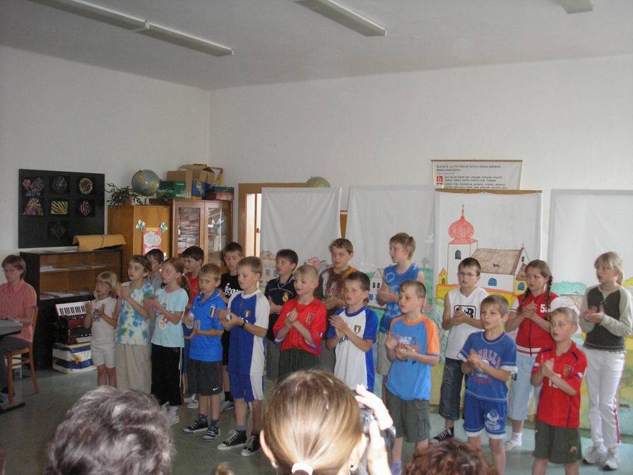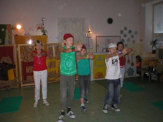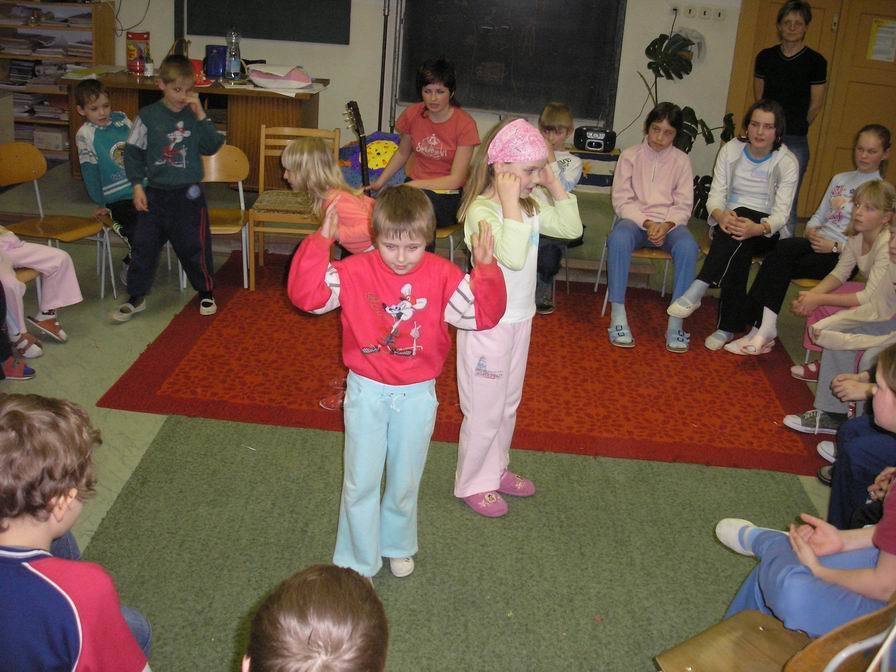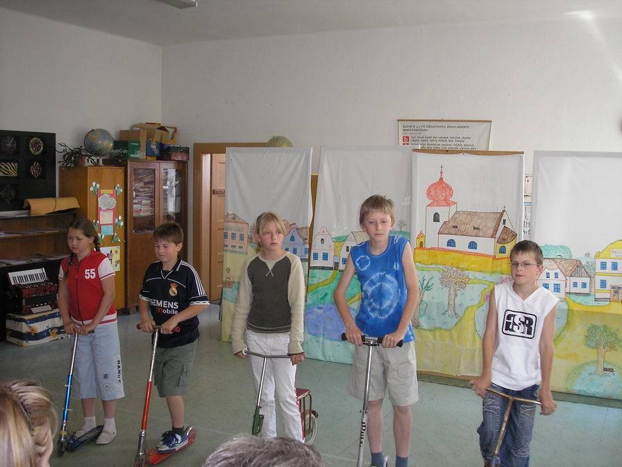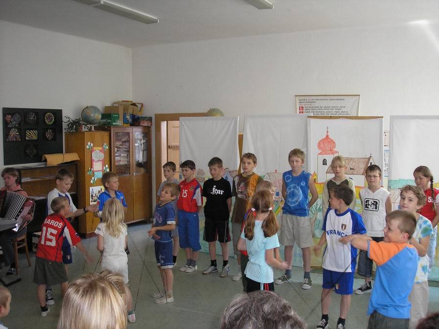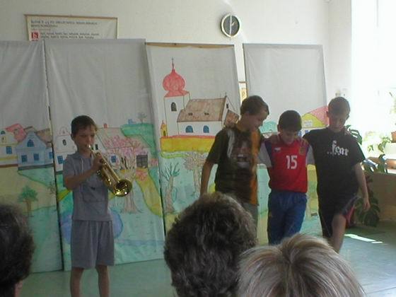 Vše vypuklo ve čtvrtek 10. května ve 14 hodin. Zaplněnému hledišti jsme předvedli, jak se děti z naší fiktivní vesnice baví. Jednotliví aktéři (tedy my) se scházeli „na návsi,“ odkud ve skupinkách mířili na hřiště. A tak se na scéně objevili fotbalisté, koloběžkáři nebo skokani (a to přes švihadlo a přes gumu). Publikum se také mohlo zaposlouchat do tónů „Muzikantské rodiny,“ jejíž členové hráli např. na pokličky, vařečky, lžičkou na skleničky apod. Ale byli tu i muzikanti se skutečnými hudebními nástroji – Rosťa B. zahrál na trubku píseň „Tři citrónky“ a Kristýnka C. dvě lidové písničky na keyboard. Kromě nich paní učitelka doprovázela náš zpěv hrou na akordeon a keyboard.
