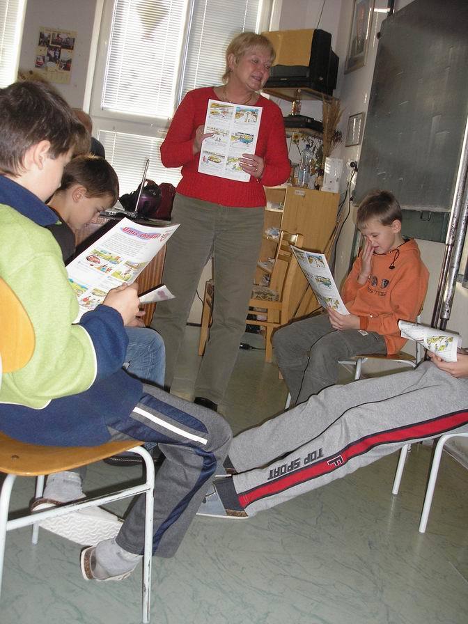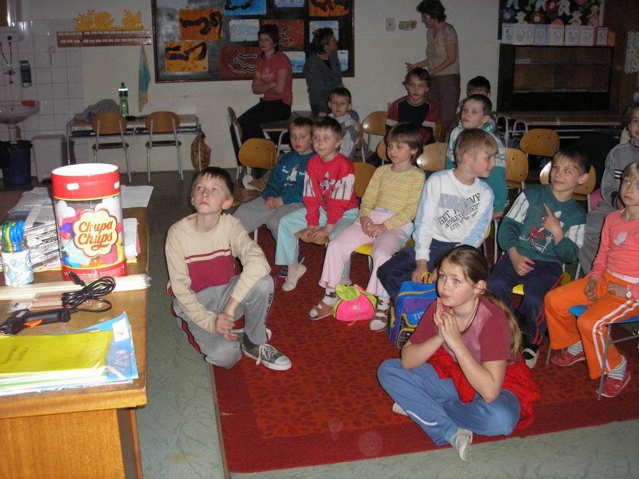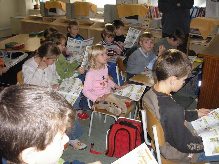 Na naší škole měly možnost vyslechnout tuto přednášku všechny děti. Seznámily se s pravidly chůze a jízdy po silnici, po chodníku, na přechodu, na stezkách pro chodce i pro cyklisty. Paní Jelínková jim ukázala značky, které by měly znát, vysvětlila jim jejich význam a seznámila je také se základními pravidly přednosti v jízdě na křižovatkách.