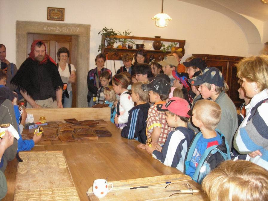 Na rozdíl od Jeníčka a Mařenky jsme, jak se sluší a patří, zaklepali i pozdravili a vousatá ježibaba nás pustila dovnitř. Kromě výroby perníku nám představila své divoké létající koště, které se nepovedlo zkrotit ani některým vyvoleným z našich řad, a ukázala nám svou moderní troubu na pečení perníku. Také jsme se podívali do místnosti s názvem „Ježíškovo nebe“ nebo do pekla.
