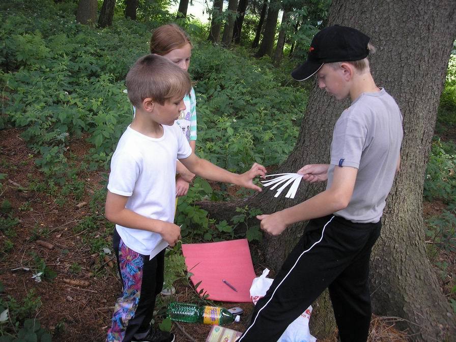Potom jsme se přesunuli z Horní Březiny, kde se hra „Štěstí“ odehrávala, do Dolní Březiny. Tam jsme absolvovali další dvě soutěže. V první z nich jsme potřebovali jak štěstí, tak rozum. Byli jsme rozděleni do čtyř družstev. Jednalo se o štafetový závod v hledání rozházených kartiček se slovy, ze kterých jsme postupně skládali hádanku. Po nalezení všech slov jsme museli společně hádanku přečíst a uhádnout správnou odpověď.